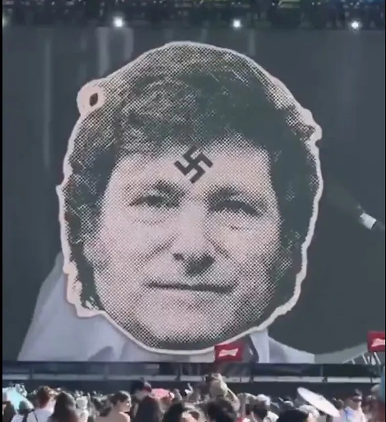 Según trascendió, la proyección se realizó mientras la banda interpretaba una versión del tema “Ultraderecha”, del histórico grupo chileno Los Prisioneros. La secuencia incluyó imágenes de otros líderes internacionales, como el expresidente de Estados Unidos Donald Trump, el primer ministro de Israel Benjamin Netanyahu y el mandatario chileno José Antonio Kast.